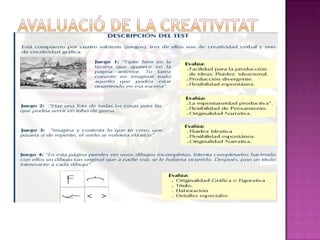 CREA : serveixper a mesurar la creativitat fent que el subjecte avaluat elabori preguntes després de presentar-li un material gràfic. Prova d'imaginació creativa per a joves PIC-J o per a nens (PIC a) serveix per a mesurar la creativitat verbal, narrativa, figurativa i gràfica des de 1r ESO a 2n Batxillerat. AVALUACIÓ DE LA CREATIVITAT