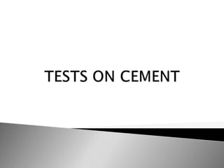 Cement tests can be divided into field tests and laboratory tests. Laboratory tests include fineness test, standard consistency test, setting time test, compressive strength test, soundness test, and tensile strength test. The fineness test measures the mean size of cement grains and finer cement results in earlier strength development but more shrinkage and cracking. The standard consistency test determines the percentage of water required to form a cement paste using a Vicat apparatus. The setting time test uses the Vicat apparatus to detect when cement paste reaches its initial and final set. The compressive strength test forms cement mortar cubes which are tested at 3 and 7 days to determine strength. The soundness test uses a Le-Chatelier apparatus to