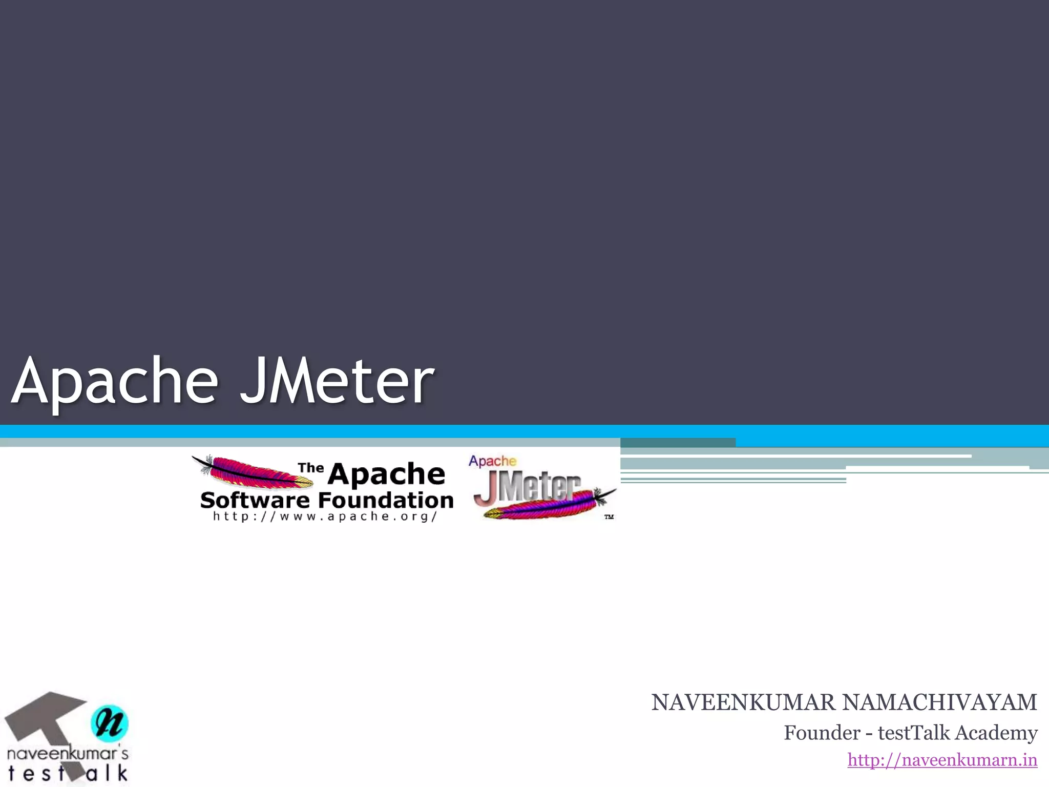 The document provides an overview of Apache JMeter, an open-source load testing tool. It discusses what organizations want to avoid through load testing and defines load testing. It then introduces JMeter, covering its requirements and installation, architecture, key elements of a test plan like thread groups, controllers, samplers, listeners, timers, assertions, and more. It explains concepts like logic controllers, test fragments, and distributed testing capabilities. The document is a guide to using JMeter for load and performance testing.