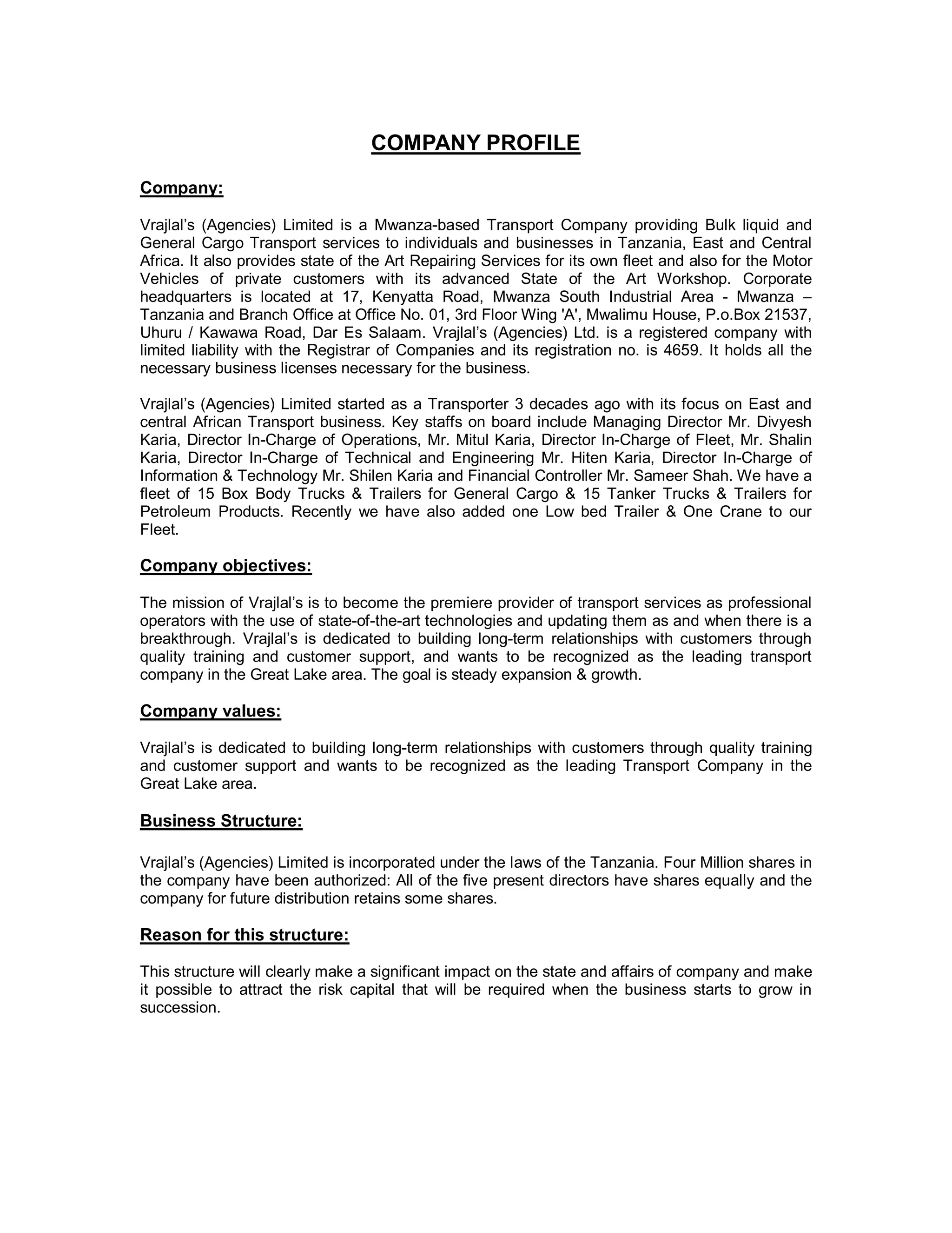 Vrajlal's (Agencies) Limited is a transport company based in Mwanza, Tanzania that provides bulk liquid and general cargo transport services across East and Central Africa. It operates a fleet of 30 trucks and trailers, including 15 for general cargo and 15 tankers for petroleum products. The company aims to be a premier transport provider using state-of-the-art technologies. It is dedicated to building long-term customer relationships through quality training and support. Vrajlal's has extensive health, safety, environmental, and quality management plans and policies to ensure compliance with regulations and safe, sustainable operations.