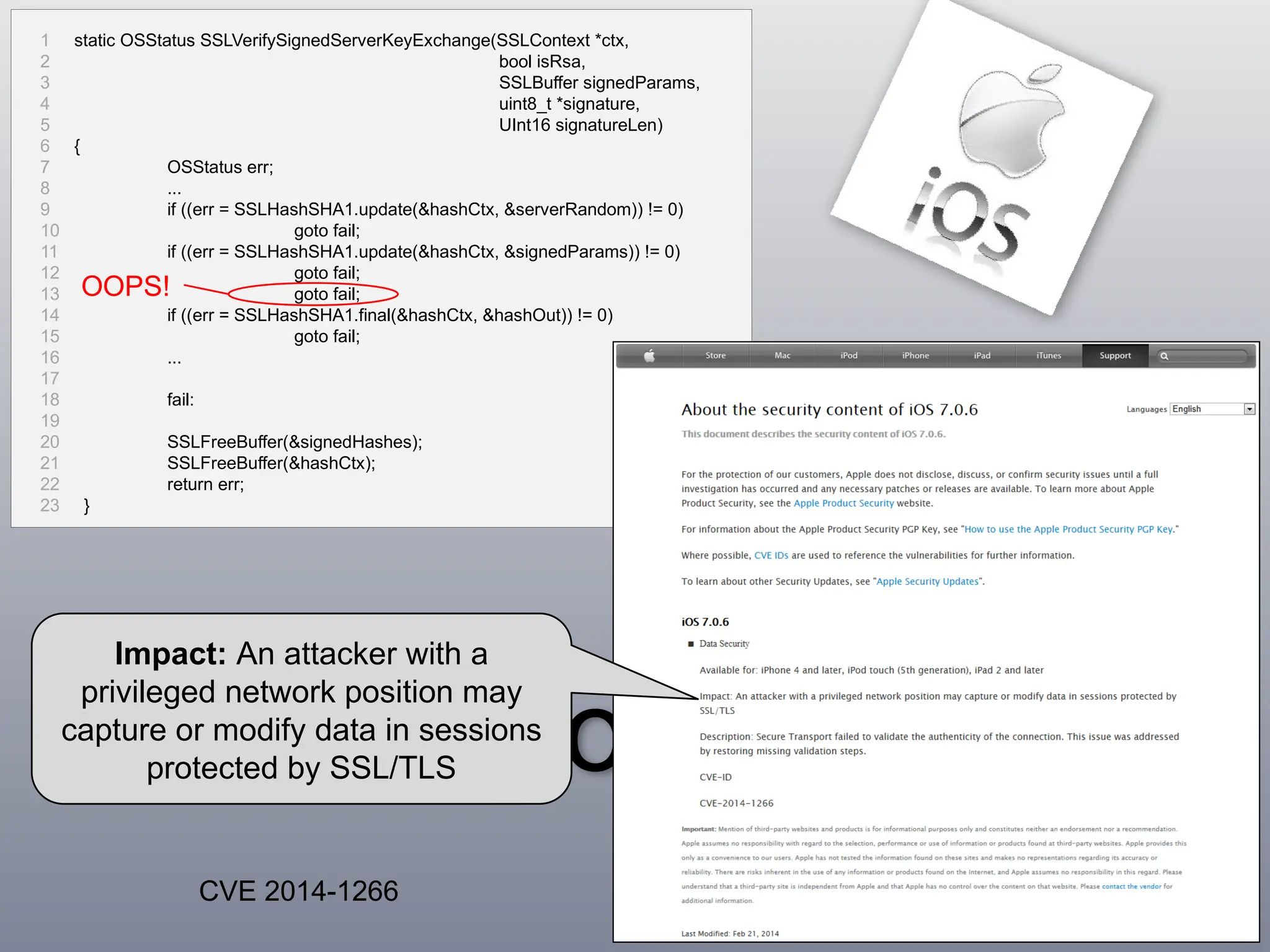 Part of the validation code during a SSL/TLS key exchange in iOS is shown here on the slide. This code goes through a number of checks against the certificate that was provided. If any of them fail, then it jumps down to the end and returns the failed result. On Feb 21 Apple released a security alert and provide an update to iOS. The alert didn't give many details but it quickly caught the interest of the security community.