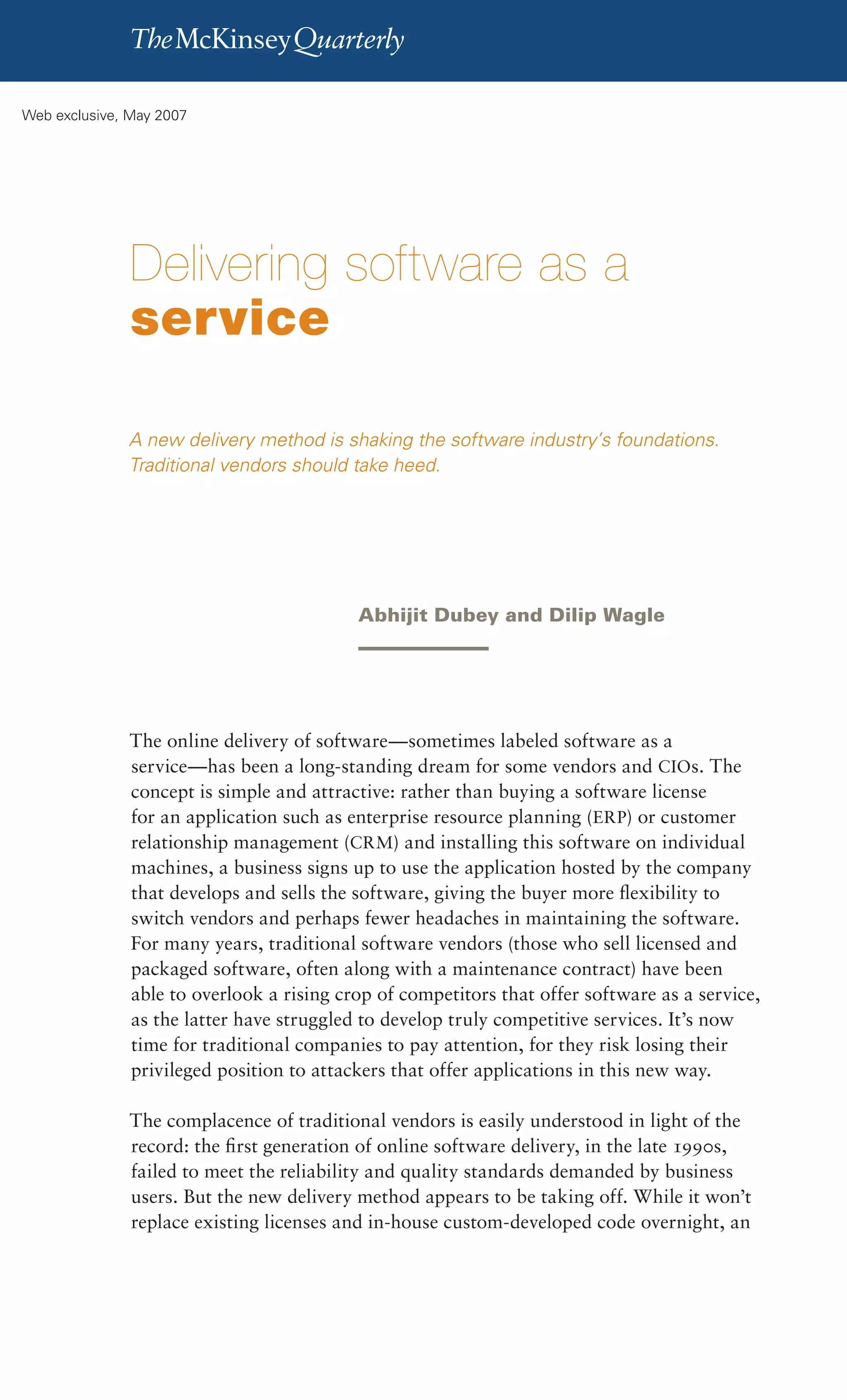 This document discusses the rise of software as a service (SaaS) delivery models which allow companies to access software applications over the internet rather than buying licenses and installing software on their own machines. Some key points: