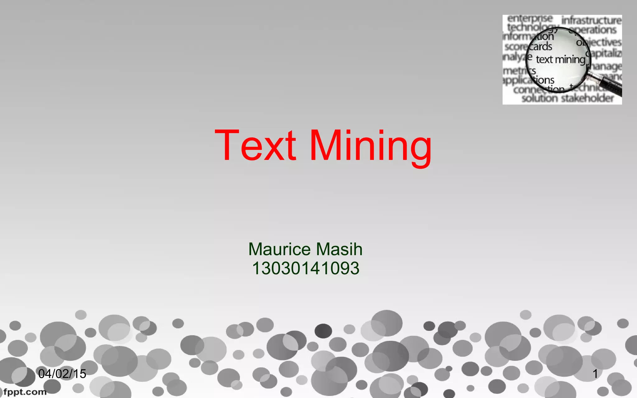 The document discusses text mining and is divided into several sections. It begins with an introduction to text mining, explaining that it is the process of deriving useful information from unstructured text sources. It then covers text mining techniques like text preprocessing, transformation, attribute selection and data mining. Specific techniques discussed include document clustering, text representation as bags of words, and dimensionality reduction. The document also discusses how text mining can be applied to analyze documents in Google Sheets and extract key entities, concepts, and sentiment. It concludes that text mining generally involves analyzing text documents to extract important elements and then applying numeric data mining techniques to the processed text.