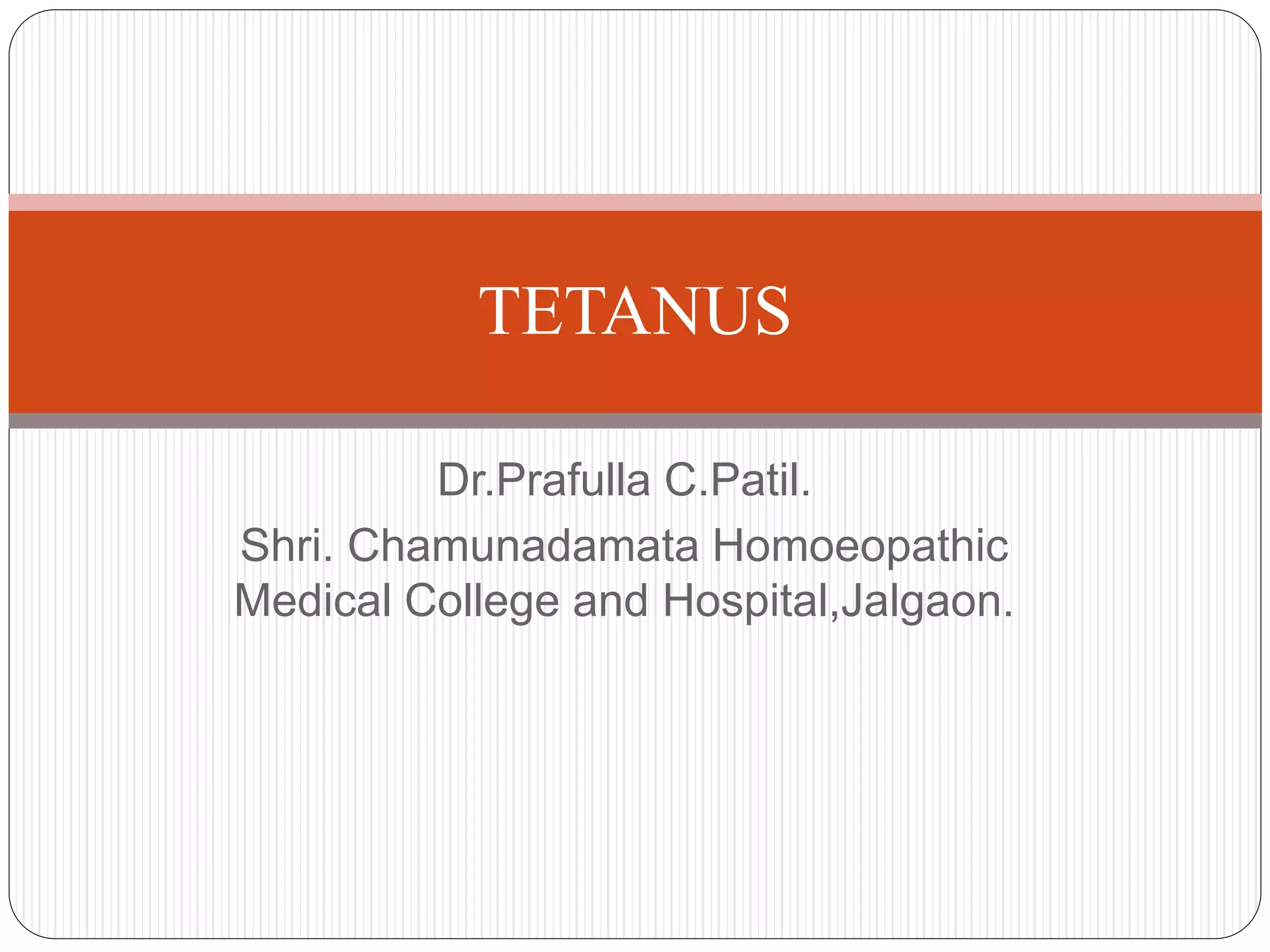 This document discusses tetanus (lockjaw), caused by Clostridium tetani bacteria. It can enter the body through wounds or the umbilical cord in neonates. The bacteria produce toxins that cause painful muscle spasms. Symptoms include jaw stiffness, neck rigidity, swallowing difficulties, and spasms triggered by stimuli. Treatment involves wound care, antibiotics, tetanus immunoglobulin, sedation and respiratory support. Homeopathic remedies that may help include Nux Vomica, Ledum, Aconite, Hypericum and Ignatia. Prevention relies on tetanus vaccination of mothers during pregnancy and infants through childhood.