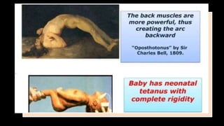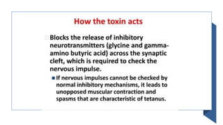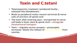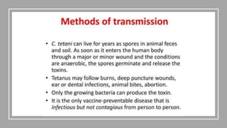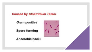 Tetanus is caused by Clostridium tetani, a bacteria commonly found in soil and the intestines of humans and animals. The bacteria produces a toxin called tetanospasmin that affects the anterior horn cells of the spinal cord, causing painful muscle rigidity and convulsions. Symptoms include lockjaw (trismus), risus sardonicus (contraction of facial muscles), and board-like abdominal rigidity. Management of tetanus involves neutralizing the toxin with tetanus antitoxin, debriding wounds to prevent further toxin production, antibiotics to prevent secondary infections, muscle relaxants to control spasms, and maintaining hydration, nutrition, and a quiet environment for