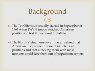 The document summarizes the effects of the Tet Offensive which began in 1967 when North Vietnamese troops attacked American positions. While the US was able to repel the attacks, the extensive scope and destruction undermined public support for the war in America. This led to requests for more troops but ultimately embarrassment for the Johnson administration and caused him to not seek re-election, enabling Richard Nixon to win the presidency and eventually negotiate a peace agreement and withdrawal from Vietnam.