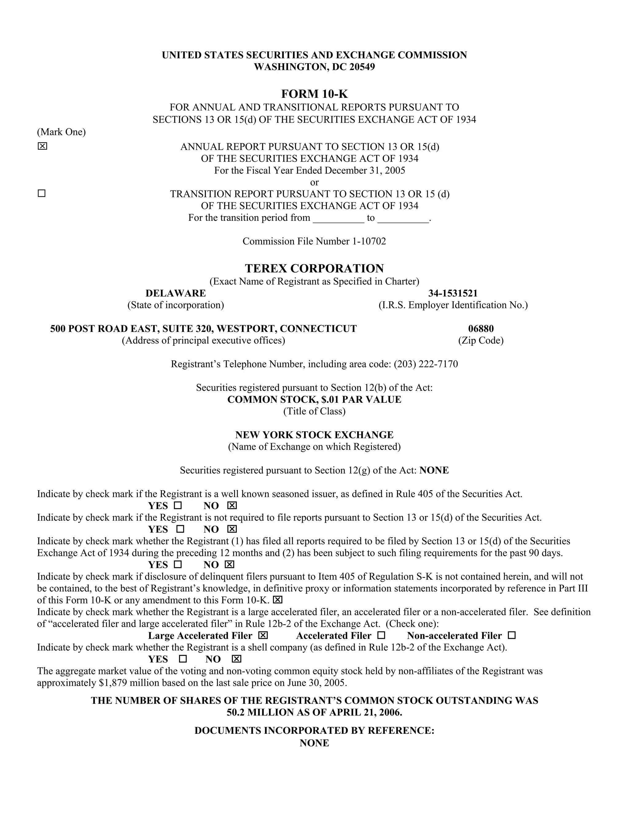 This document is Terex Corporation's annual report (Form 10-K) filed with the SEC for the fiscal year ended December 31, 2005. It provides information on Terex's five business segments: Terex Construction, Terex Cranes, Terex Aerial Work Platforms, Terex Materials Processing & Mining, and Terex Roadbuilding, Utility Products and Other. It describes the types of equipment each segment produces and identifies their major manufacturing locations. The report is filed annually with the SEC to provide information on Terex's financial performance and operating structure to investors.