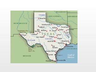 Texas is the second largest state in the U.S. with an area of almost 270,000 square miles and a population of 24.7 million residents. The passage describes several linguistic features of Southern American English dialects, including vowel changes, dropping or changing consonants, use of past participles instead of past simple verbs, double modals, and distinctive greetings and words. It provides an example script of an interview with a woman from Amarillo, Texas who discusses her family and background.