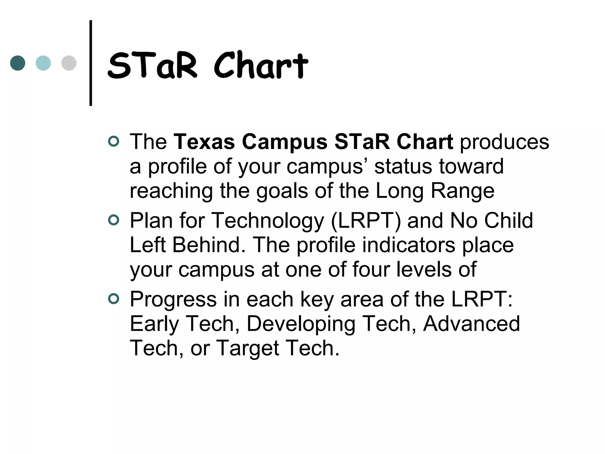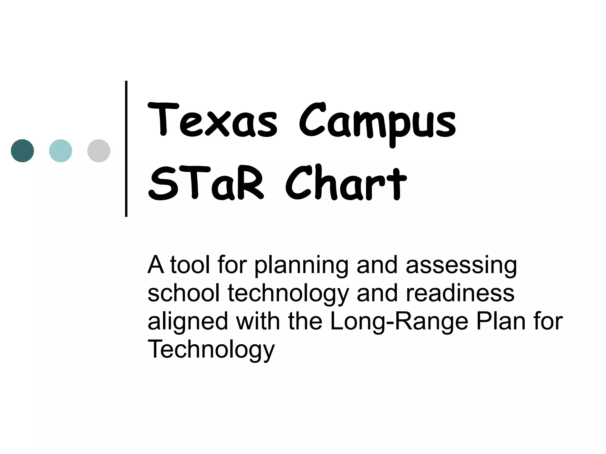 The document discusses the Texas Campus STaR Chart, a tool that assesses a school's technology readiness based on the state's Long-Range Plan for Technology. It provides the STaR Chart profile for Chisholm Trail Middle School, which shows the school is at the "Advanced" level in teaching and learning, educator preparation, and leadership. However, the school's goal is to achieve the highest "Target" level in all areas, including reducing the student to computer ratio. The STaR Chart can help schools evaluate their technology status, measure progress towards state goals, and identify areas for improvement.
