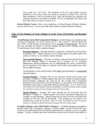 The Texas civil court system is divided based on jurisdictional limits and case type. At the trial level, there are district courts, which have general jurisdiction over civil matters without a monetary limit. County courts have jurisdiction over civil cases up to $10,000. Justice of the peace courts have exclusive jurisdiction over civil cases up to $200. Actual damages in civil cases include economic damages to compensate for monetary losses, and non-economic damages for physical and mental pain and suffering. Exemplary or punitive damages may also be awarded if the plaintiff can prove fraud, malice, or gross negligence by clear and convincing evidence. Common types of damages in personal injury cases in Texas include compensation for physical and mental anguish, disfigurement,