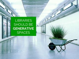 This document contains images and snippets of text from various sources about libraries and their role in communities. It discusses how libraries can be disruptive by providing access to knowledge and how they help shape school and community culture. It also questions how libraries can capture and tell the story of learning as well as embrace wonder, possibility, and the spirit of "What if?".