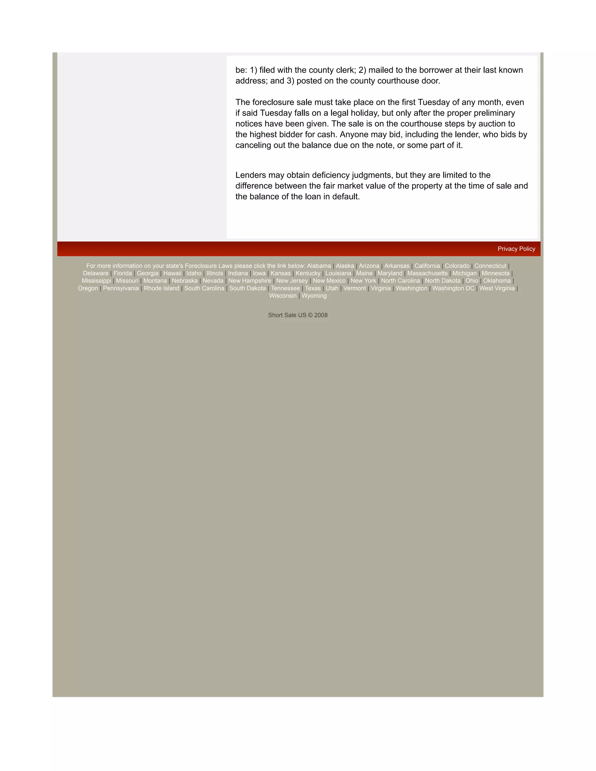 In Texas, lenders have two options to foreclose on a property in default: judicial foreclosure which involves a court order, or non-judicial foreclosure which is more common and involves a power of sale clause. For non-judicial foreclosure, the lender must send notice at least 20 days before foreclosure and post a notice at the county courthouse at least 21 days before auctioning the property to the highest bidder. Deficiency judgments are allowed in Texas to recover any remaining unpaid portion of the defaulted loan.
