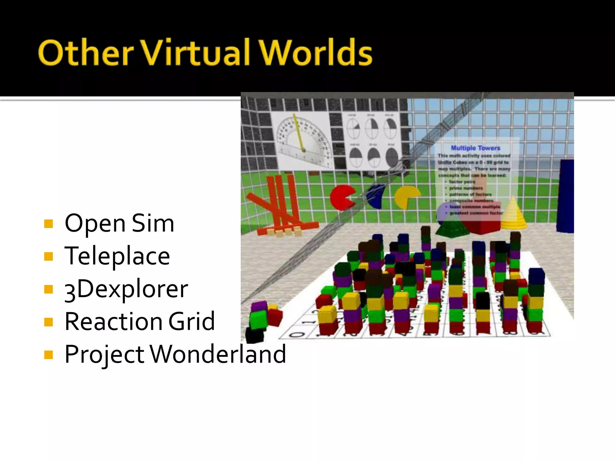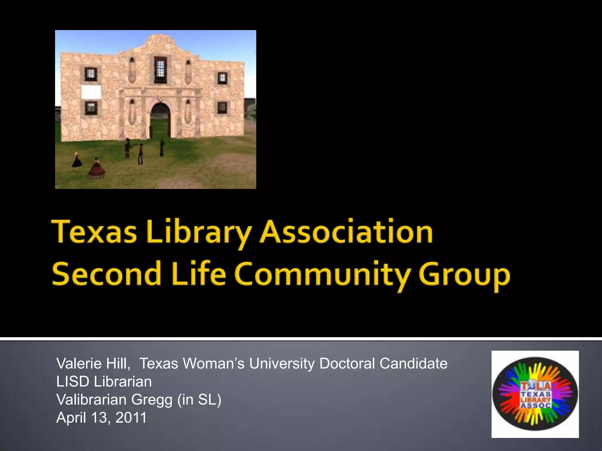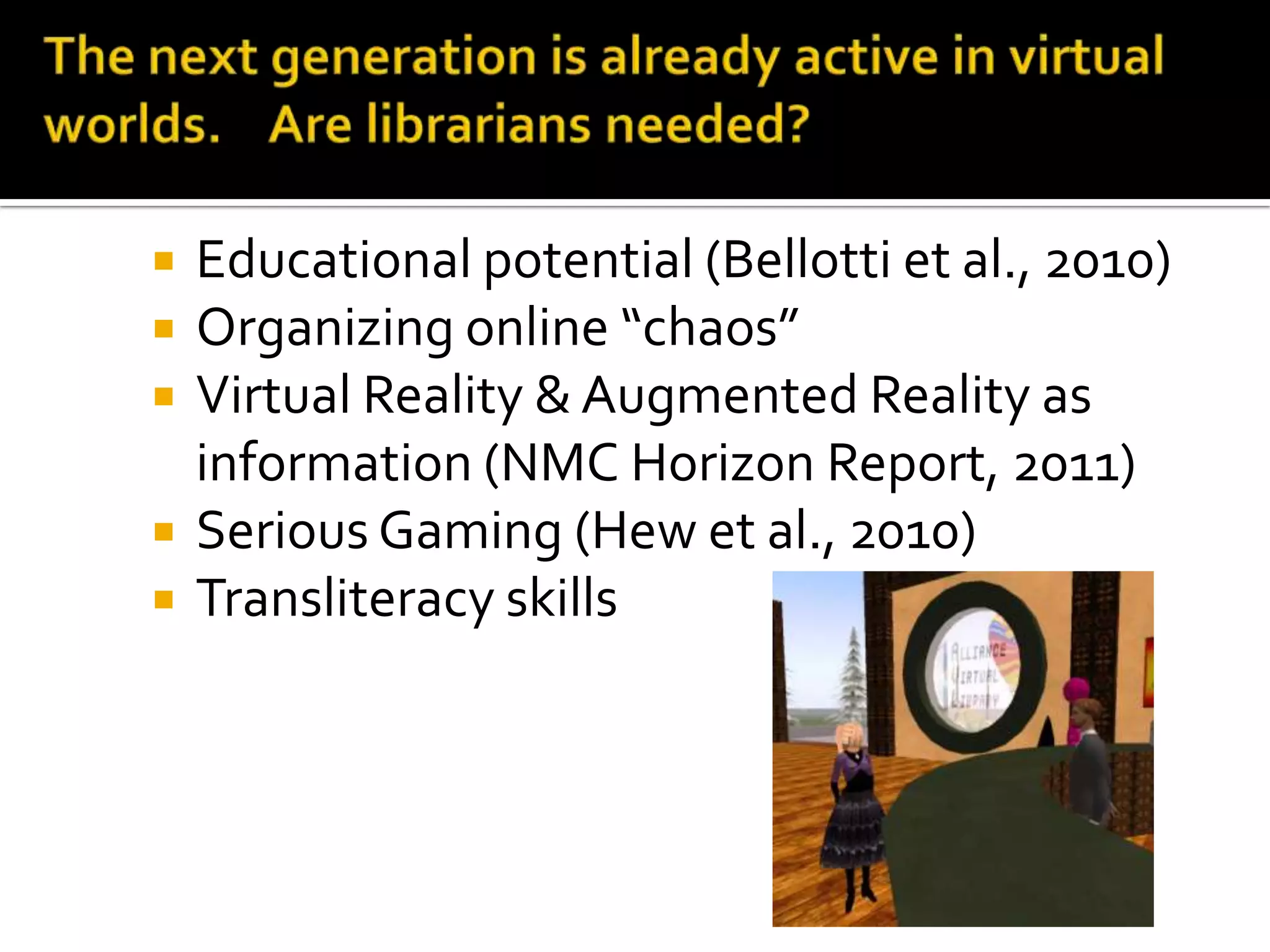 The document discusses the potential roles of librarians in virtual worlds like Second Life. It outlines 10 ways librarians can utilize virtual worlds, including creating displays, hosting conferences and classes, facilitating book discussions, and engaging in storytelling. The document also notes educational opportunities in virtual worlds and references several studies on this topic. It describes schools of library and information science engaging in virtual worlds for collaboration, networking, and professional development.
