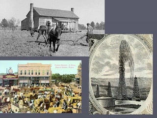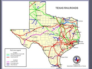 The document discusses how railroads transformed Texas in the late 1800s. Railroads expanded across the state, connecting towns and enabling industries like cattle driving and agriculture to boom. As railroads grew, so did Texas' population and economy. However, this also led to new problems that politicians had to address, such as unfair shipping prices charged by railroads. The Railroad Commission was established in 1891 to regulate railroads and stop unfair practices.