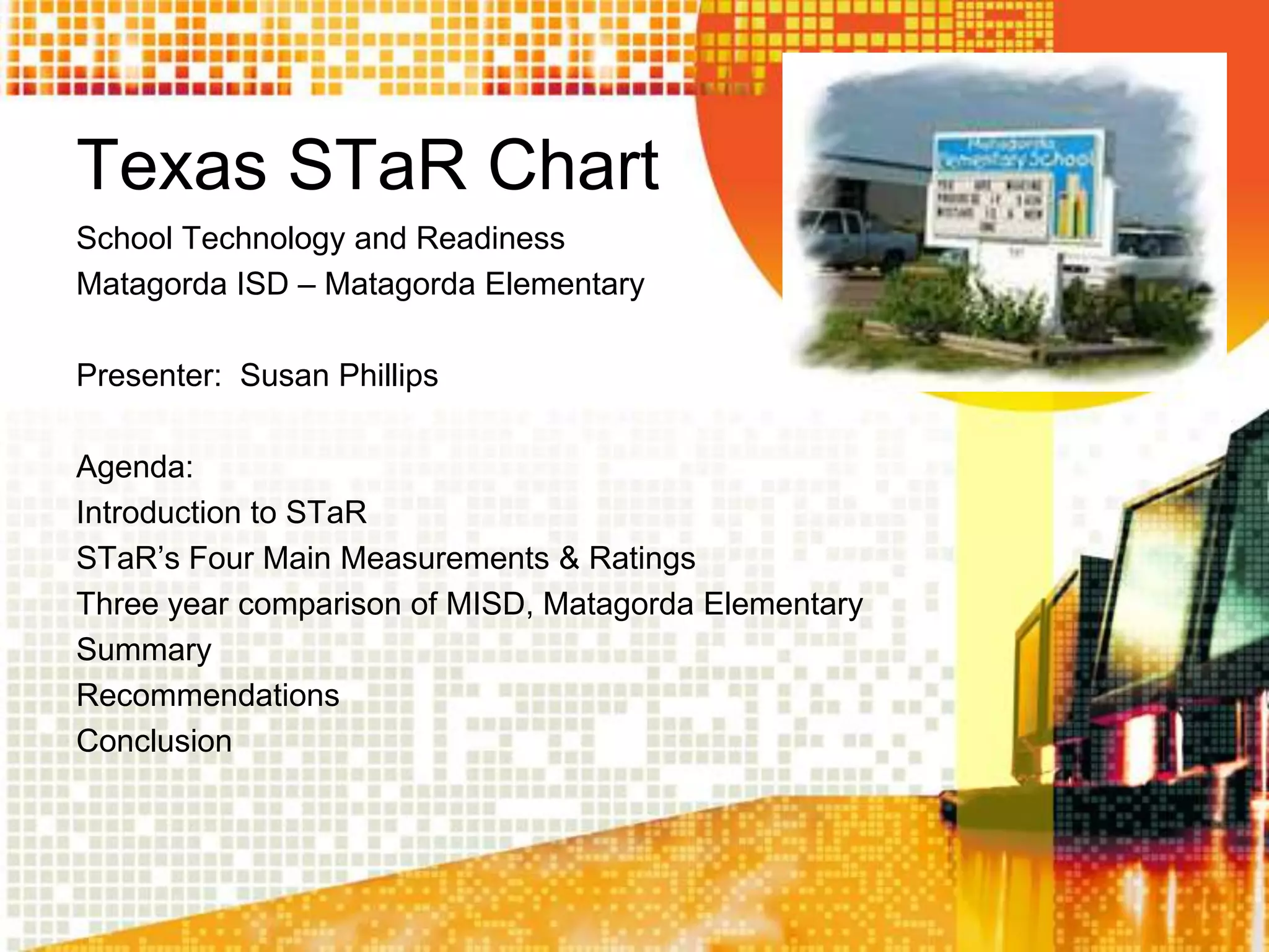 This presentation summarizes Matagorda ISD's progress using the Texas STaR Chart, which measures schools' technology integration. It discusses the four key measurement areas of the STaR Chart: teaching and learning, educator preparation, leadership/support, and infrastructure. The presentation shows Matagorda Elementary's ratings over three years, starting in the "Early Tech" range and improving to "Developing Tech." It recommends continuing to align technology with curriculum and instruction so students are prepared for digital learning. The goal is helping students learn in a technology-rich environment.