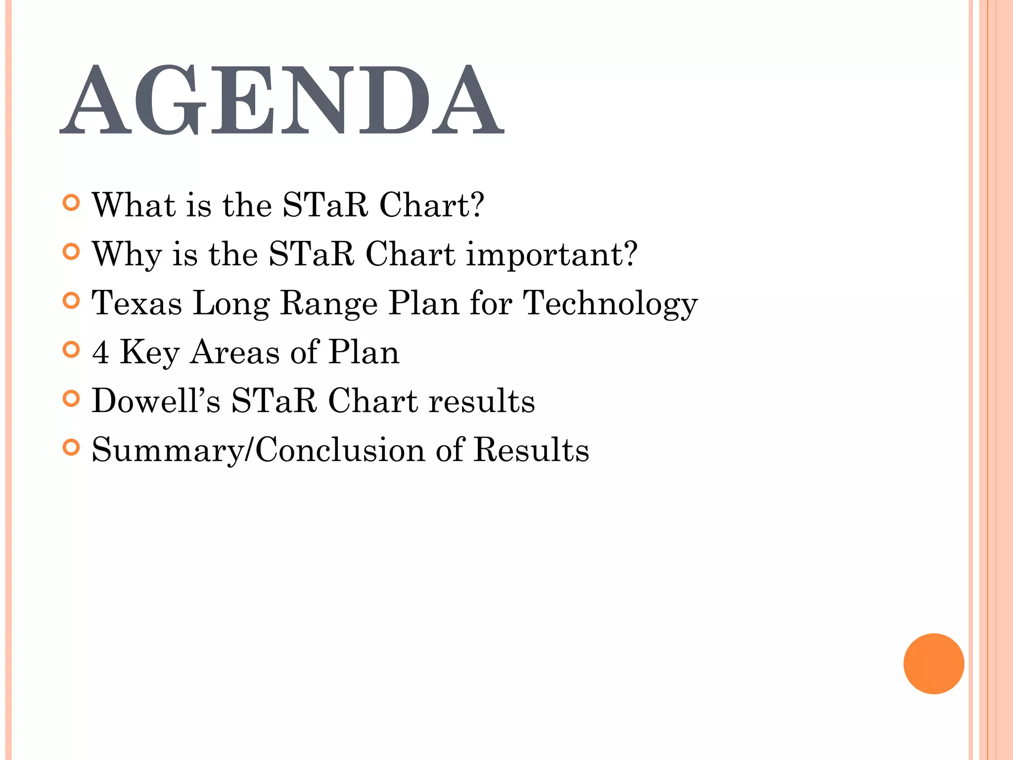 The document summarizes the STaR Chart, a tool used by Dowell Middle School to assess and plan their technology integration. It discusses the four key areas of the Texas Long Range Technology Plan and Dowell's results in each area from 2008-2009, showing they are at the "Developing Technology" level. It concludes that improvements are needed to ensure all educators meet technology proficiency standards, increase technical support, provide adequate funding, purchase more computers, and better align technology use with curriculum and assessment.