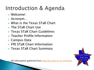 The document discusses the Texas STaR Chart, which is an online tool that allows stakeholders to view the technology readiness of Texas campuses. The STaR Chart evaluates four key areas - Teaching and Learning, Educator Preparation, Leadership/Administration, and Infrastructure. Campuses receive a rating in each area based on their level of technology integration. The document provides instructions for teachers to complete the STaR Chart survey and for administrators to view campus data reports. It also shares the ratings and progress over time for one sample campus.