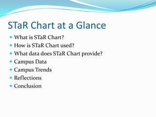 The Texas Star Chart provides data on a school's level of educational technology integration in four key areas: Teaching and Learning, Educator Preparation and Development, Leadership/Administration/Support, and Infrastructure. It classifies schools as Early, Developing, Advanced, or Target in each area. The document discusses a school's Star Chart data from 2007-2009 that showed it declining from Advanced to Developing levels. It reflects on how the data can help planning and identifies next steps like using the data for staff development and integrating technology throughout curriculum and instruction.