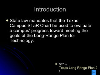 The document discusses using the Texas Campus STaR Chart to evaluate HP Carter Career Center's progress toward technology goals in its long-range plan. It provides background on the school, which serves grades 6-12 and offers alternative programs. It then summarizes HP Carter Career Center's level of progress on the STaR Chart as developing technology, and provides examples of systems like Renzulli Learning and APEX that provide evidence of its growth. It concludes that the school is working to align with the state's long-range technology plan and build life-long learners.