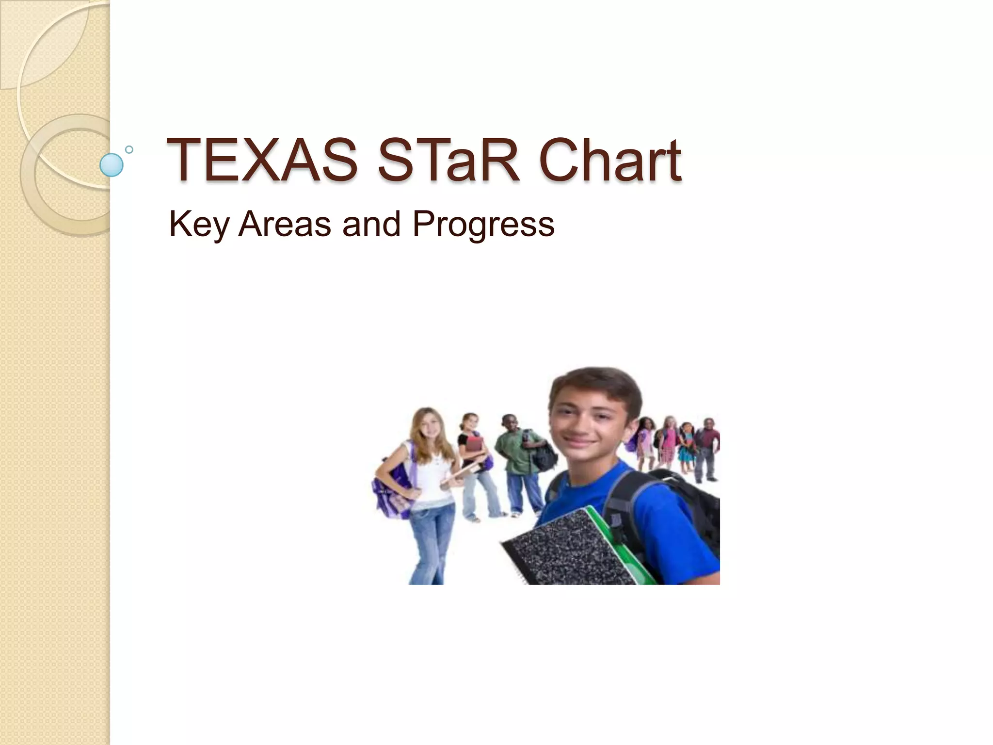 The TEXAS STaR Chart measures school technology progress across 4 key areas: Teaching & Learning, Educator Preparation, Administration & Support, and Infrastructure. Each area is rated on a scale from Early Technology to Target Technology based on metrics like student to computer ratios, technology integration, and staffing levels. The document provides examples of the criteria for ratings at each level of progress within each category. It then summarizes one school's ratings across the 4 categories for 2006-2007 through 2008-2009, showing improving levels of technology adoption over time.