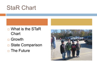 The document describes the STaR Chart, which is a survey used in Texas to determine school progress in meeting technology goals. The STaR Chart evaluates schools across four domains: Teaching & Learning, Educator Preparation & Development, Leadership/Administration/Support, and Infrastructure. It is used to classify schools at different levels of technology implementation and readiness based on factors like classroom tech use, educator training, leadership support, and equipment availability.