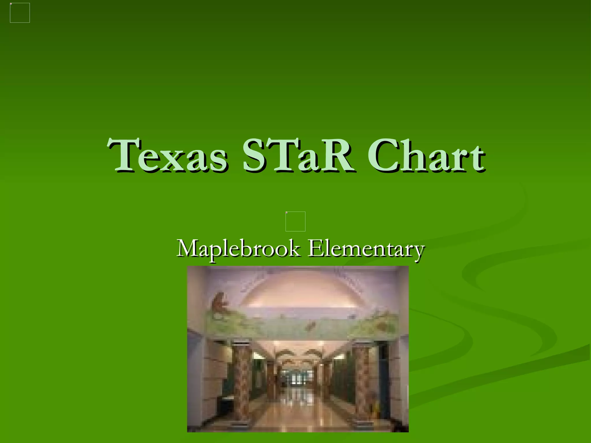 The STaR Chart is a tool used in Texas to measure schools' use of technology across four domains: teaching and learning, educator preparation, leadership and infrastructure. Schools can be rated at four levels from early to target tech. Maplebrook Elementary recently completed their STaR Chart and found their rating had dropped over the past year, indicating areas that need improvement according to their campus improvement plan to increase technology use.