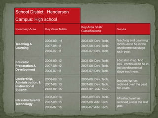 The Texas Star Chart is a tool for planning, assessing, and evaluating a school or district's educational technology profile based on the goals of the Long Range Plan for Technology. It examines components across four key areas - Teaching and Learning, Educator Preparation and Development, Leadership/Administration/Support, and Infrastructure. Each area is rated on a scale of 1-4 to indicate the level of technology integration. The Star Chart can be used for technology planning, budgeting, and evaluation, and to facilitate discussions around improving technology use and online learning to ensure the best education for students.