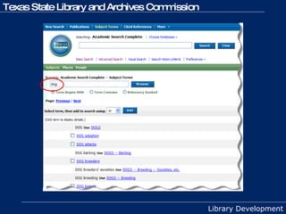 The document provides a guide on using TexShare databases for basic reference, outlining the search process and steps involved. Key components include conducting reference interviews, formulating search strategies, accessing various databases, and executing both basic and advanced searches. It emphasizes the importance of using databases for accurate information and the advantages of electronic resources over print materials and internet search engines.