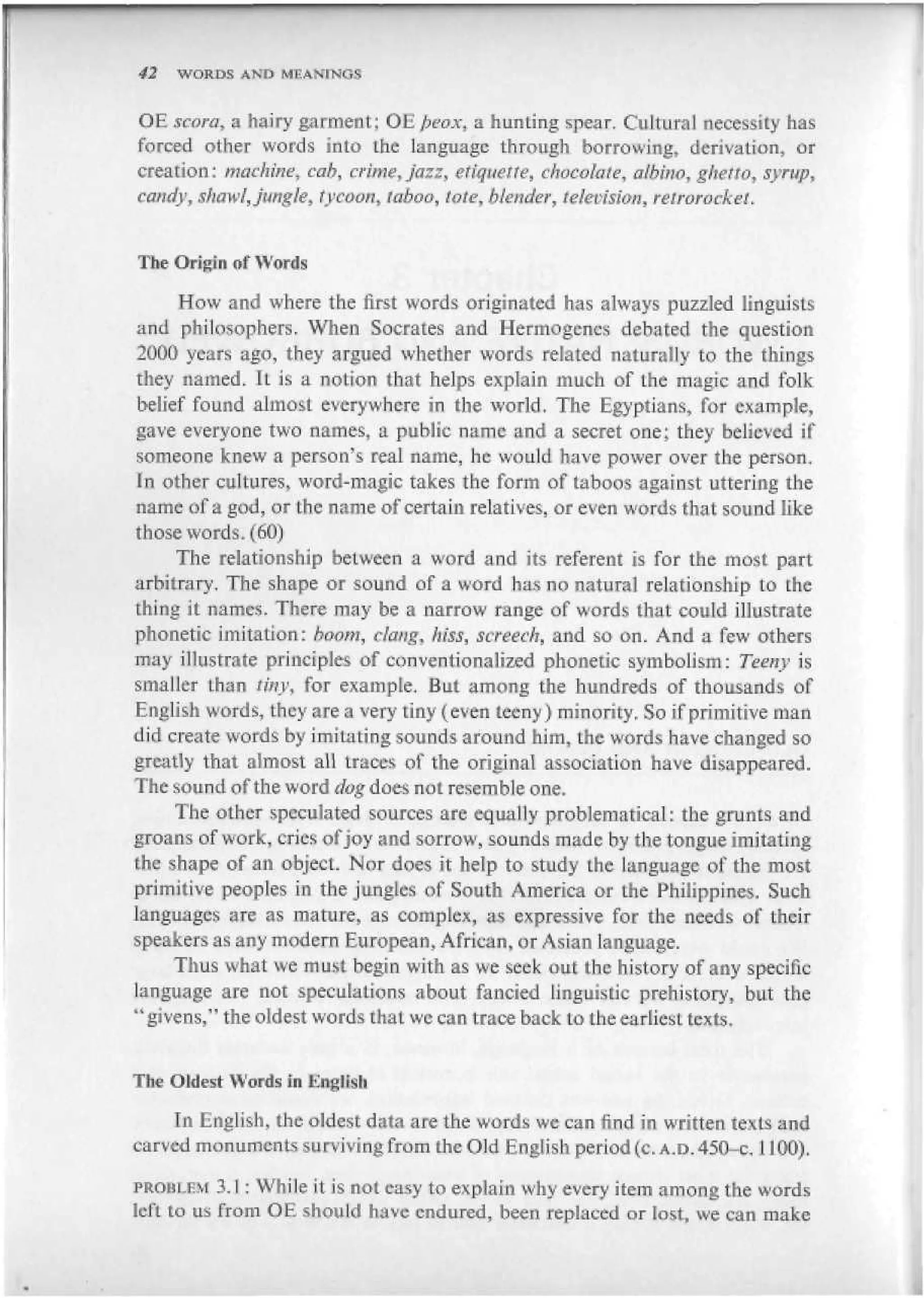 This document discusses the origins of words in English and other Indo-European languages. It examines old English words and their modern English descendants to understand Anglo-Saxon culture. It also analyzes cognates across Indo-European languages to reconstruct proto-Indo-European, their hypothesized common ancestral language. Similar basic words across languages suggest inheritance rather than borrowing. Comparing referents represented suggests the original Indo-European homeland was in a northern temperate region near the sea and forests.