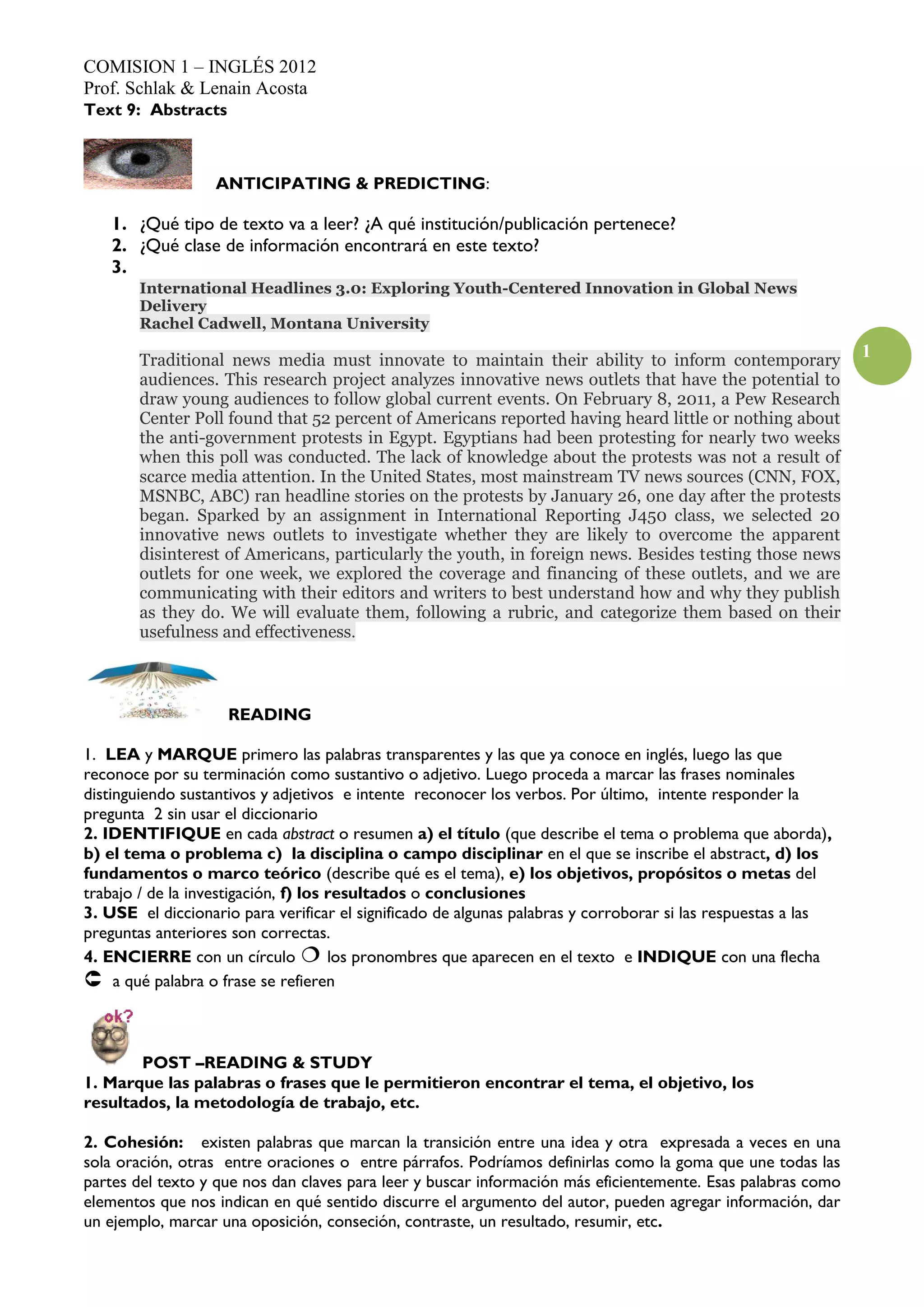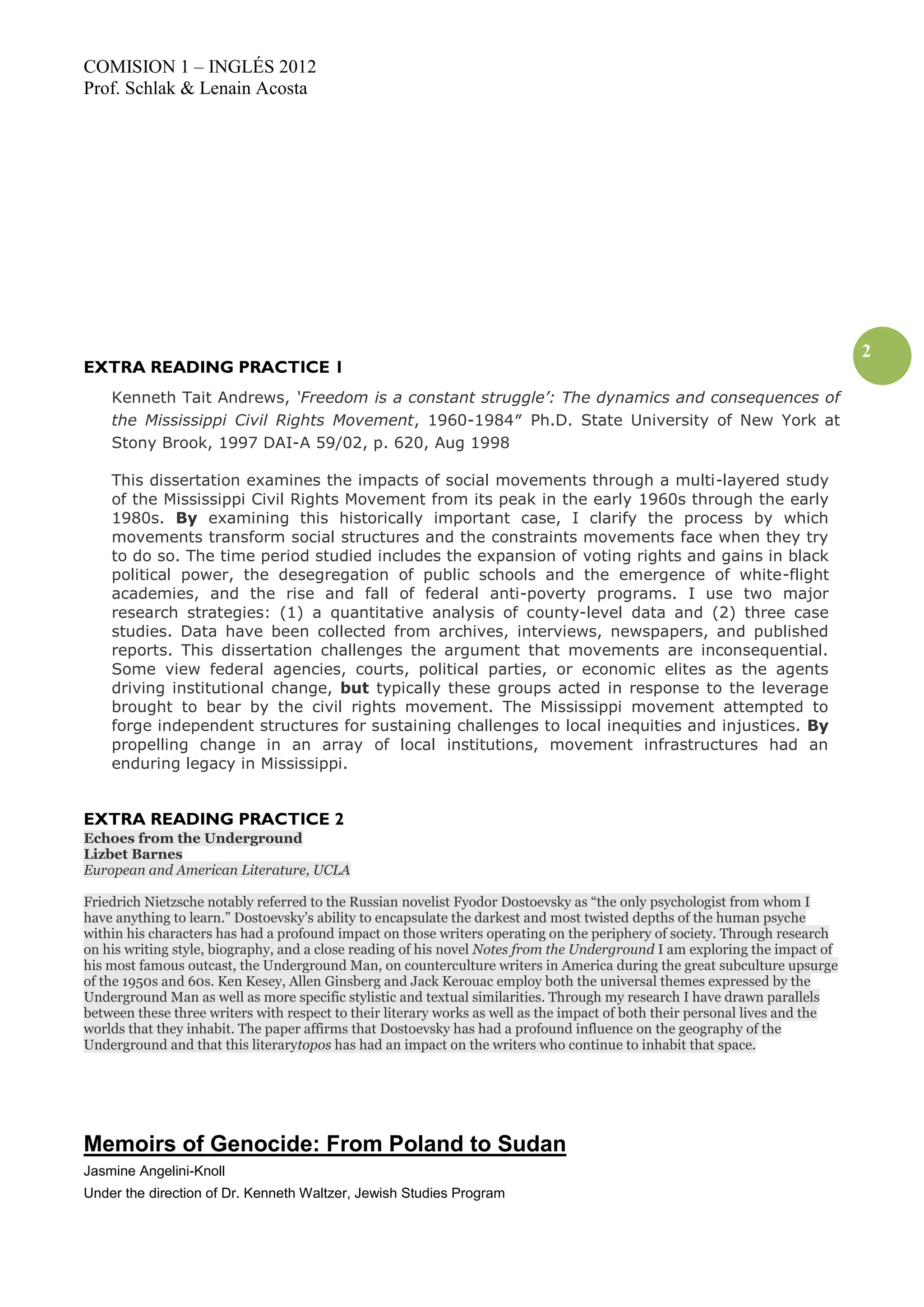This document contains instructions and examples for analyzing abstracts from academic papers and research. It provides guidance on identifying key elements like the title, topic, discipline, objectives, methodology, and conclusions based on two sample abstracts. The first abstract examines the impact of the Mississippi Civil Rights Movement from 1960-1984 using quantitative analysis and case studies. The second analyzes the influence of Russian author Fyodor Dostoevsky on counterculture writers in America through a close reading of his work and their stylistic similarities. The document aims to help readers effectively analyze and understand the essential information presented in academic abstracts.