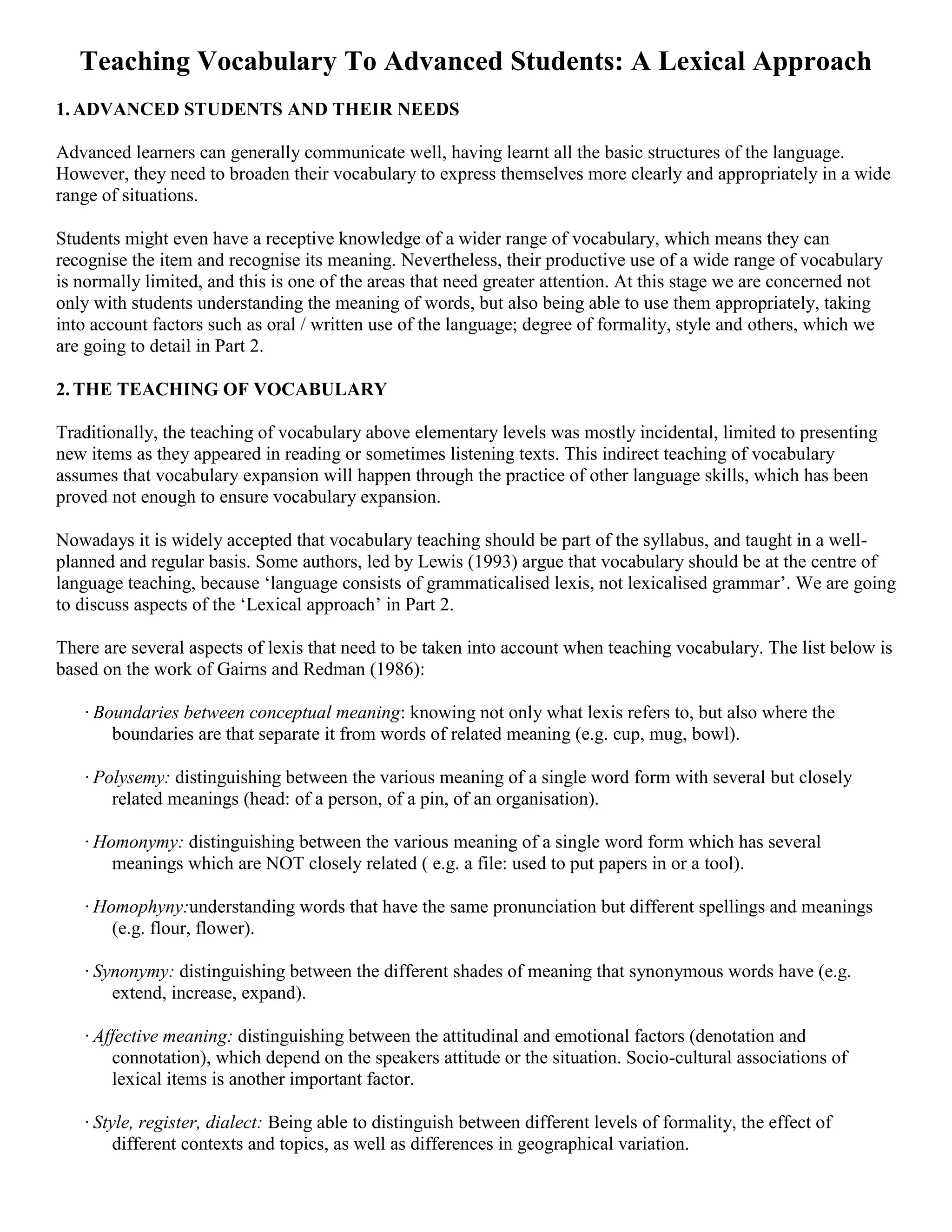 This document discusses strategies for teaching vocabulary to advanced English language learners. It emphasizes helping students broaden their productive vocabulary through activities that encourage independent word learning and use. Key recommendations include grouping vocabulary by topic to facilitate memorization, using dictionaries and context clues to discover word meanings, and providing opportunities for students to practice using new vocabulary in meaningful ways. The goal is to enable lifelong independent vocabulary expansion beyond the classroom.