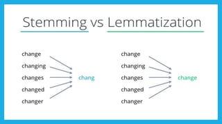 The document discusses natural language processing (NLP) and its applications in text analytics, highlighting the importance of processing human languages through methods like tokenization, stopword removal, stemming, and lemmatization. It introduces the Natural Language Toolkit (NLTK) as a tool for performing these tasks and explains key processes such as data cleaning, text classification, and named entity recognition. Overall, it emphasizes the significance of extracting meaningful information from text data.