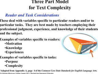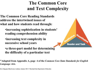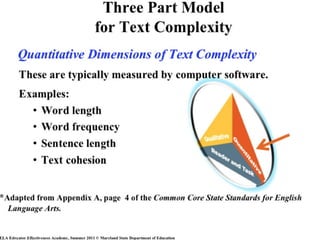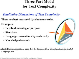 The document emphasizes the increasing importance of text complexity for success in college and the workplace, noting that while academic reading demands have intensified over the last 50 years, K-12 text complexity has stagnated. It explains the Lexile framework as a measurement tool for reading ability and text difficulty, advocating for selecting texts within a reader's Lexile range for optimal comprehension. Furthermore, it outlines instructional strategies to support students in navigating complex texts to improve their reading proficiency.