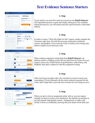 The document provides instructions for students to request writing assistance on the HelpWriting.net website, outlining a 5-step process: students create an account, submit a request form with instructions and deadline, writers bid on the request and students select a writer, the writer completes the paper and students can request revisions if needed, and students can request assistance on multiple assignments while ensuring original and high-quality content.