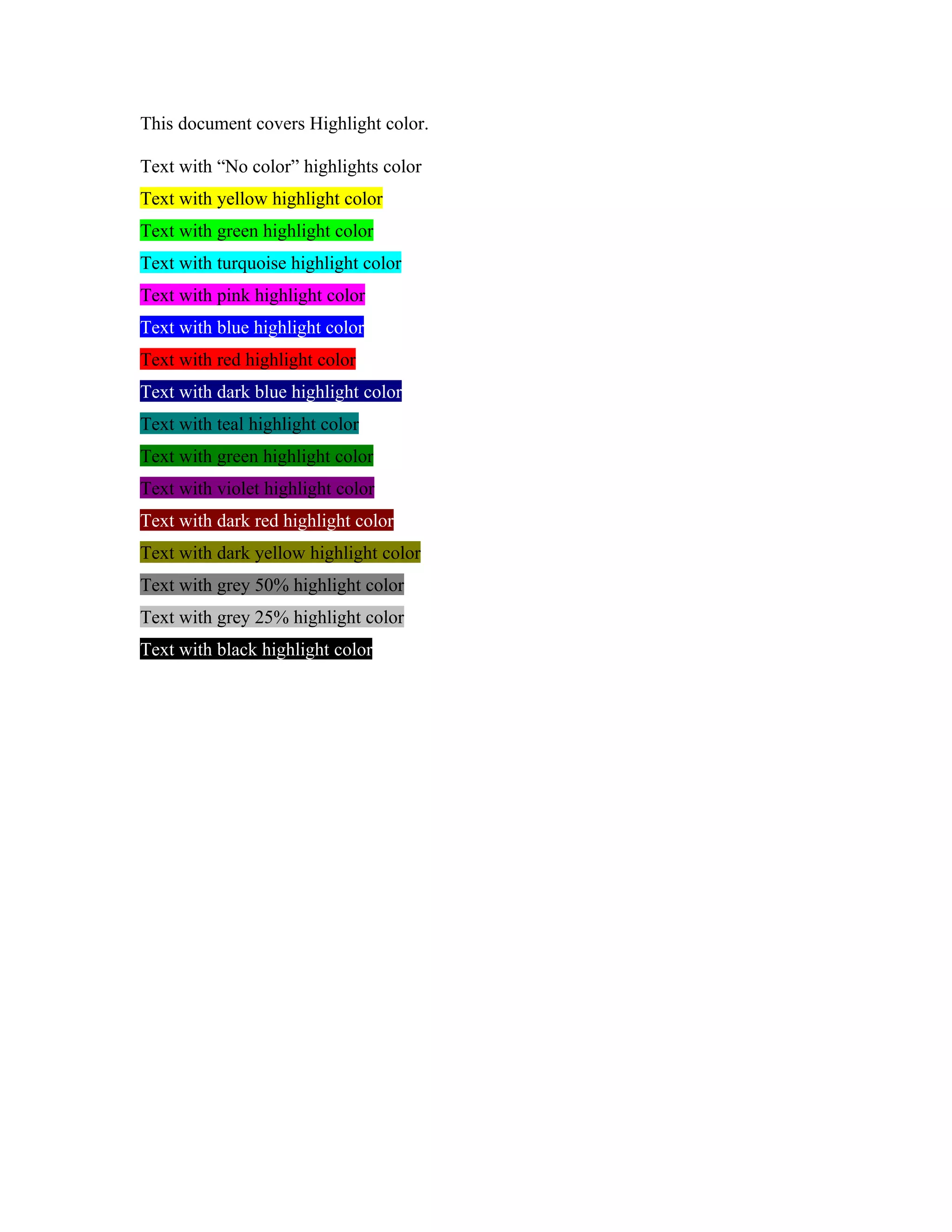 This document lists different highlight colors that can be applied to text, including no color, yellow, green, turquoise, pink, blue, red, dark blue, teal, violet, dark red, dark yellow, grey 50%, grey 25%, and black.