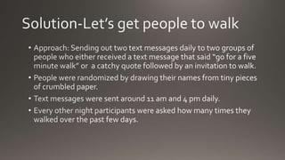 This graph shows the total number of extra daily walks taken by different groups as the number of extra daily walks per person increases from 0 to 5. The "Walk Only" group sees a linear increase in total extra walks as each additional person walks more each day. The "Quote" groups, which include both walkers and non-walkers, see a slower sub-linear increase as not all members of the group increase their daily walks.
