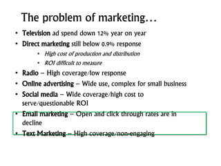 The document discusses the challenges that small businesses face with traditional marketing methods and how mobile marketing can help address these challenges. It notes that mobile marketing through text/SMS provides high open rates, engagement, and measurability compared to other channels. The document provides examples of how businesses can use text messaging to reduce no-shows, drive foot traffic, manage inventory, and increase average order value. It also offers tips for crafting effective text messages and guidelines for when to send messages to avoid being pushy.