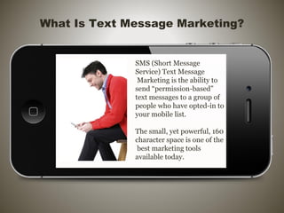 - Text marketing allows you to send permission-based messages to opted-in mobile contacts and has high open and response rates.