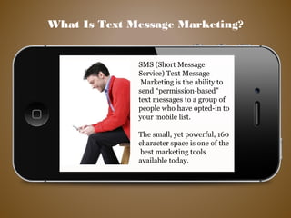 This document provides tips and ideas for using text message marketing for a personal training business. It discusses the benefits of text marketing such as high response rates and building client loyalty. It also provides examples of different types of text campaigns like discounts, reminders and cancellations. The document recommends ways to build a mobile list and advertise short codes. Finally, it discusses best practices and mistakes to avoid with text marketing.