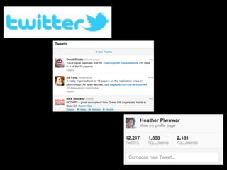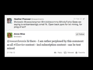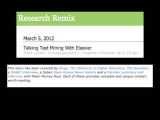 The document discusses text mining from a research perspective, highlighting the importance of obtaining publishers' permission for computer-driven data extraction. It emphasizes the benefits of open access and reuse terms without additional costs, while also acknowledging the challenges of institutional negotiations for scaling. The author reflects on the value of social media engagement in the research community.