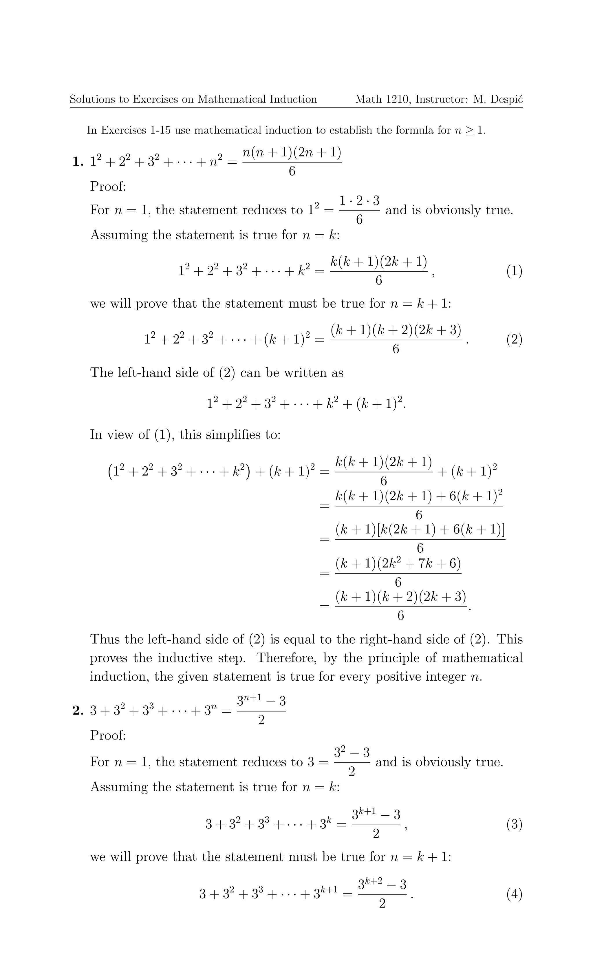 The document provides solutions to exercises on mathematical induction. It presents proofs for 7 formulas involving sums and sequences. Each proof follows the same structure: show the base case is true, assume the statement is true for some integer k, and prove it is true for k+1 using algebraic manipulations. This establishes the formula is true for all positive integers n by the principle of mathematical induction.