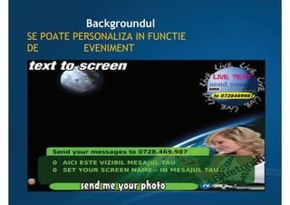 This document advertises a mobile application called "Text to Screen" that allows event organizers to display text messages and photos sent by attendees directly on screens at their venue. It promotes benefits like building participation, brand awareness through interactive chatroom-like functionality and displaying song requests or birthday greetings. The application aims to enhance the experience for clients by letting them send messages straight to screens and interact virtually.