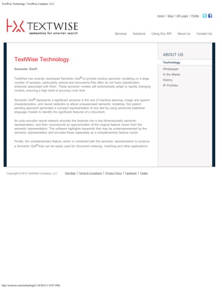 Textwise Technology has developed a semantic modeling tool called Semantic Gist®, which adapts to changing content and enhances accuracy in classifying vertical text documents. This patent-pending approach utilizes machine learning and neural networks to create compact representations of text, encoding significant features into a low-dimensional format. The software also identifies underrepresented keywords to improve document indexing and matching applications.