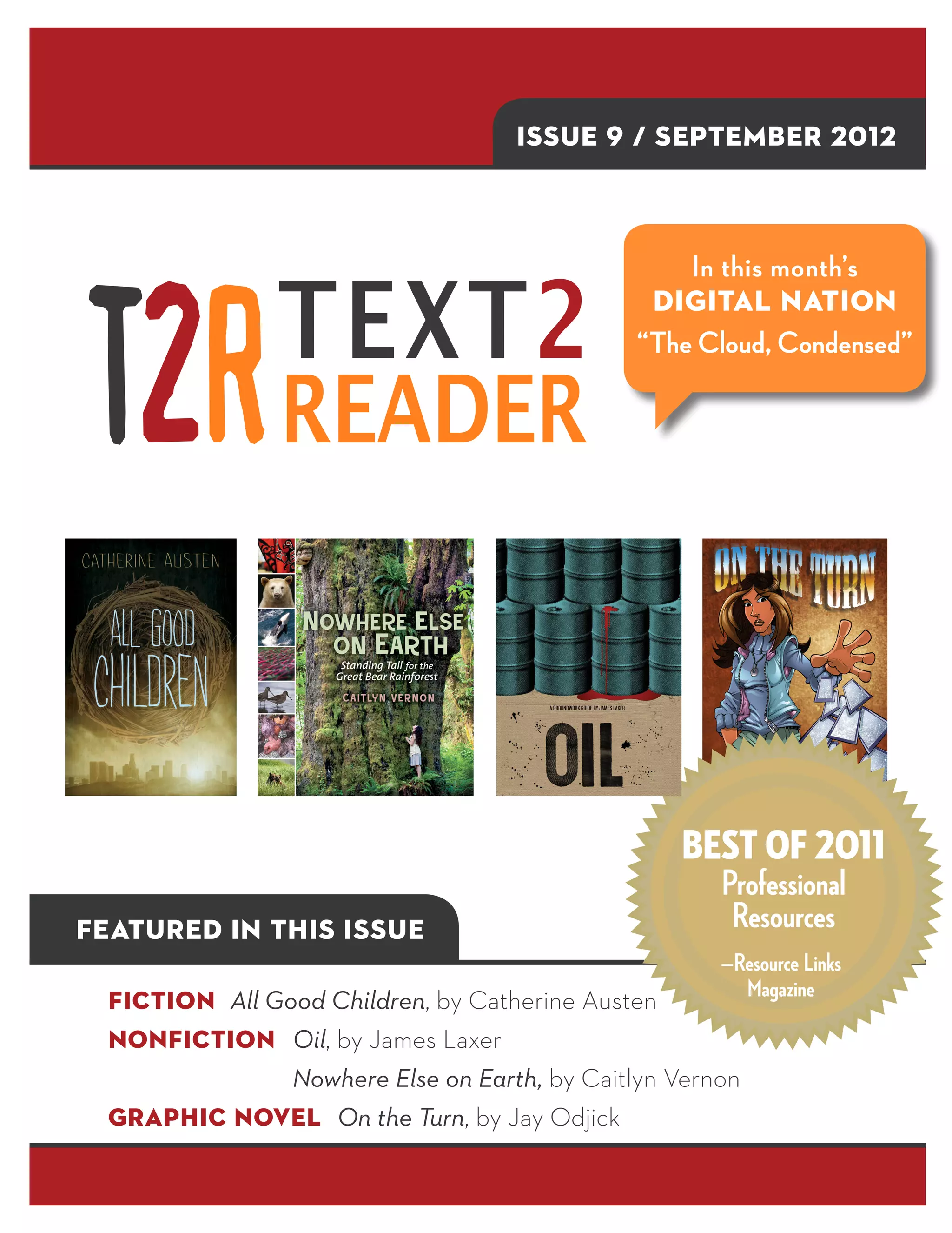 The September 2012 issue of 'Text2Reader' focuses on resources for grades 6 to 8 ELA teachers, offering a range of fiction, nonfiction, and graphic novel selections along with comprehension exercises tailored to North American learning outcomes. Featured content includes activities related to the article 'The Cloud, Condensed' and the fiction excerpt from 'All Good Children' by Catherine Austen, exploring themes of societal control and personal freedom. Additionally, the guide emphasizes its utility as a time-saving resource for educators and the flexibility of its components for classroom use.