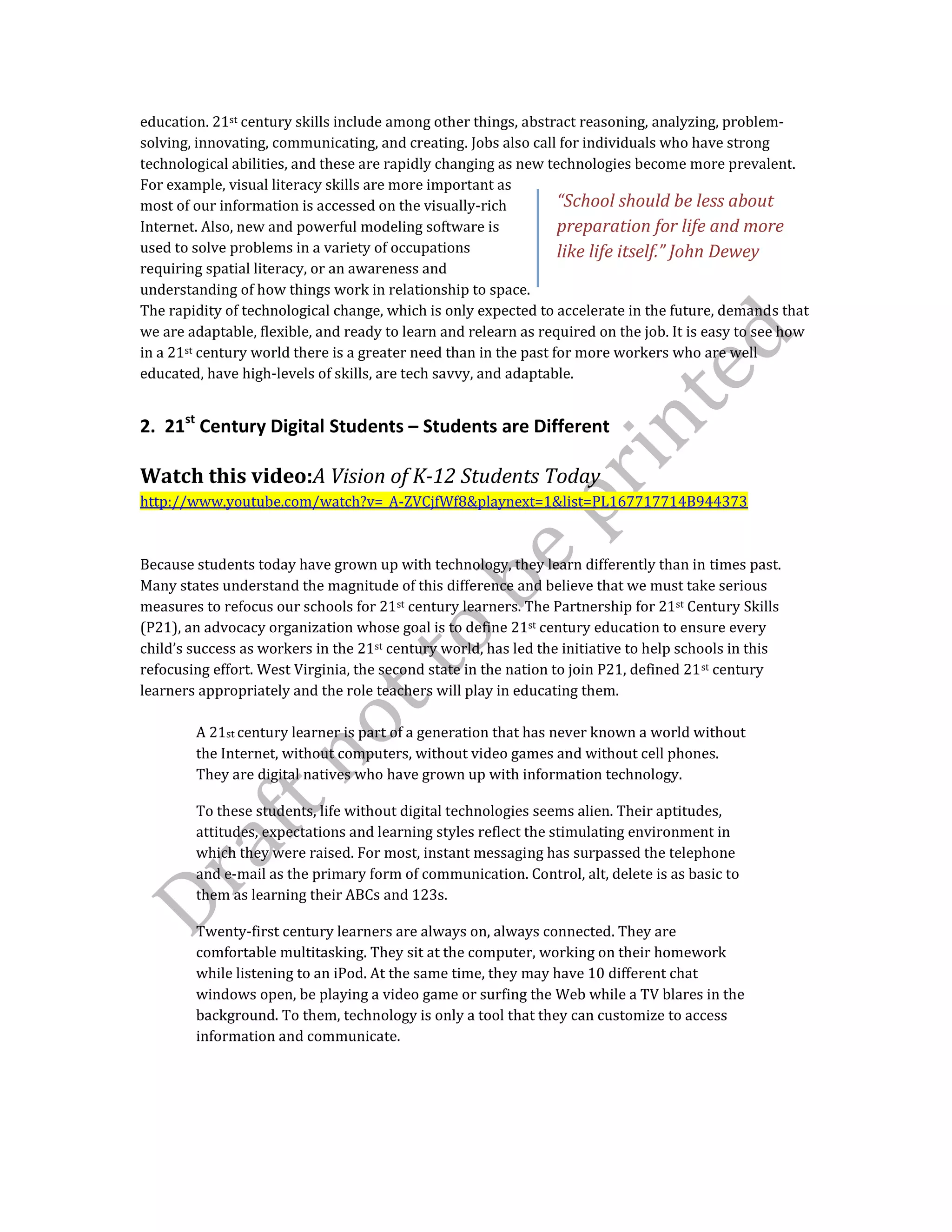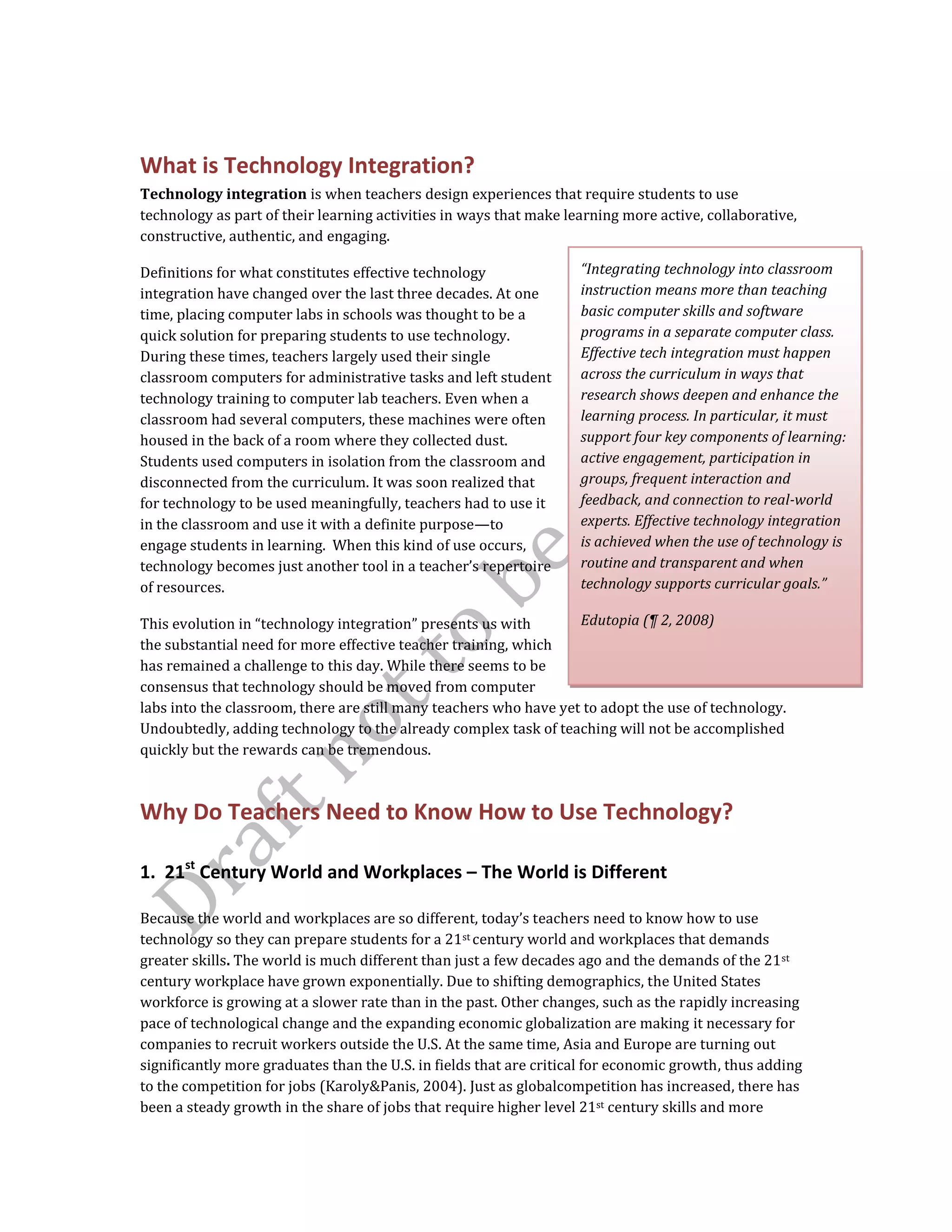 The document discusses the importance of effective technology integration in classrooms. It defines technology integration as using technology across the curriculum to make learning more active, collaborative, constructive, authentic, and engaging. While placing computers in schools was once seen as preparing students for technology use, it is now understood that technology must be meaningfully integrated into classroom instruction and curriculum. For technology integration to be effective, teachers must receive proper training and use technology as a regular instructional tool to support learning goals. The document also discusses how today's digital students and 21st century skills demand changes to how teachers prepare students and how standards now incorporate technology.