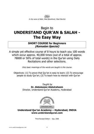 This document provides information about an 8-hour course to teach beginners 100 frequently used words from the Quran using daily recitations and selections, with the objectives of proving the Quran is easy to learn, encouraging people to study it, and helping people interact with it. The course is taught by Dr. Abdulazeez Abdulraheem, director of the Understand Quran Academy in Hyderabad, India.