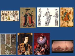 The document traces the evolution of textiles from prehistoric times to the present day. It discusses how early humans used mammoth skins sewn together for clothing in 26,000 BC. In ancient Egypt in 5500 BC, evidence exists for the production of linen cloth. In China between 500-300 BC, silk production began and was used to create Hanfu tunics. During the Roman period from 27 BC to AD 476, linen weaving techniques improved and typical garments included the peplos robe. During the Middle Ages from 1200-1400 AD, wool became commonly used and weaving techniques advanced.