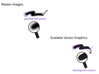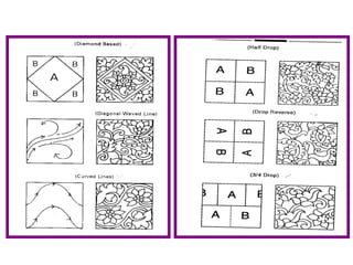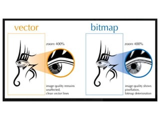 This document provides an overview of textile designing. It discusses designing tools used to create textile patterns including shapes, colors, and design references. It describes the differences between raster (pixel-based) images and vector images. Raster images use a grid of pixels and are resolution dependent, while vector images use geometric primitives like lines and curves and are resolution independent. The document also covers types of design files, the process of developing designs for different fabric structures like stripes and checks, repeating patterns, and reproducing designs. It provides examples of unique saree and wall hanging designs.