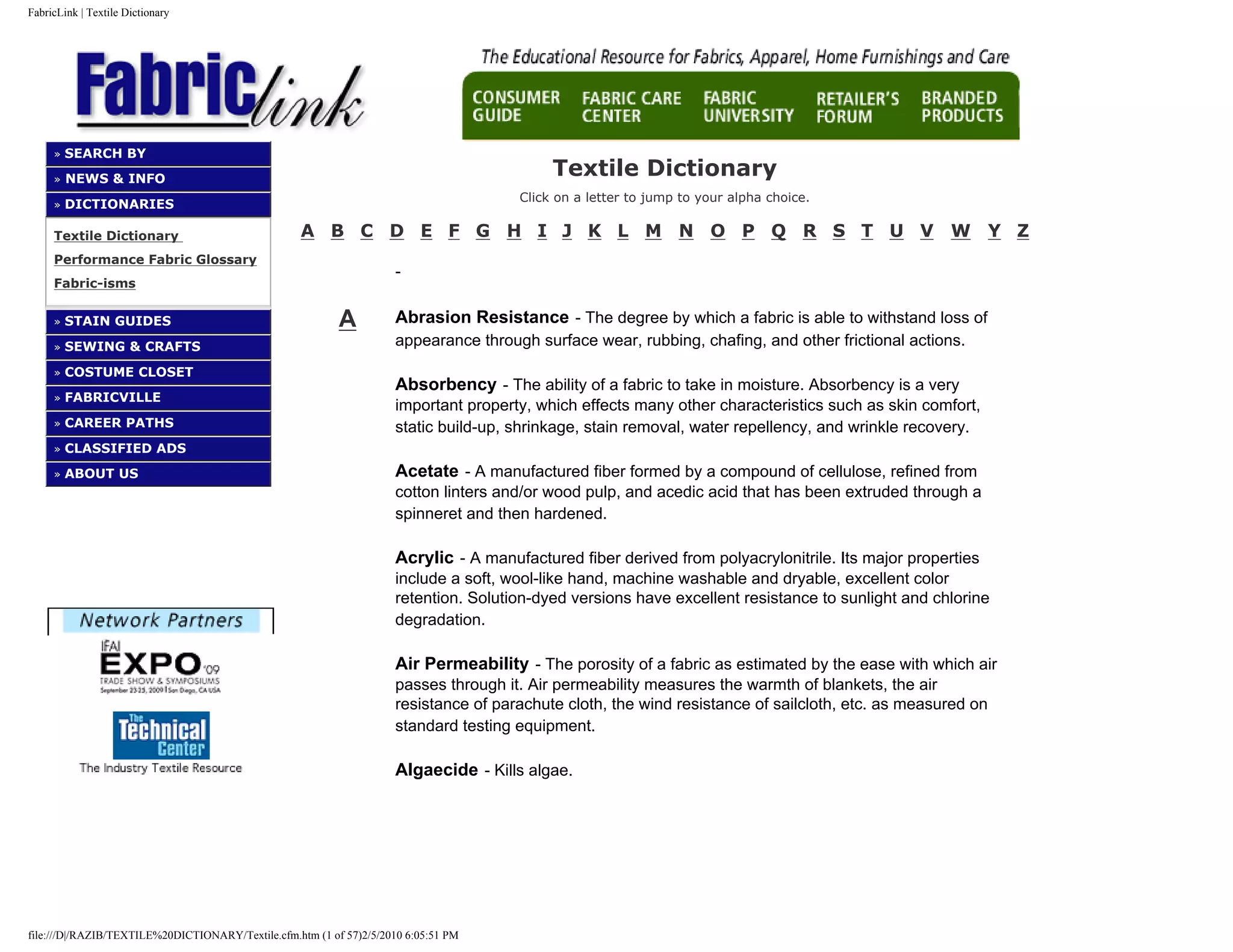 This document is a textile dictionary that defines various textile and fabric terms from A to C. It provides concise definitions for terms like abrasion resistance, absorbency, acetate, acrylic, air permeability, alpaca, angora, anti-bacterial, antifungal, anti-static, aramid and more. Each term's definition is one sentence or less. The dictionary is intended to concisely define important textile industry terms from A to C in an easy-to-reference alphabetical format.