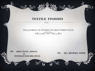 Textile finishes improve the appearance, feel, and functionality of fabrics. There are two main types of finishes - aesthetic finishes which improve visual qualities like texture or sheen, and functional finishes which provide benefits like stain resistance or crease resistance. Finishing processes include scouring to remove impurities, bleaching to produce a pure white color, dyeing or printing to add color patterns, and calendaring to produce a smooth texture. Properly finished fabrics have enhanced durability, comfort, and performance properties for long-lasting use.